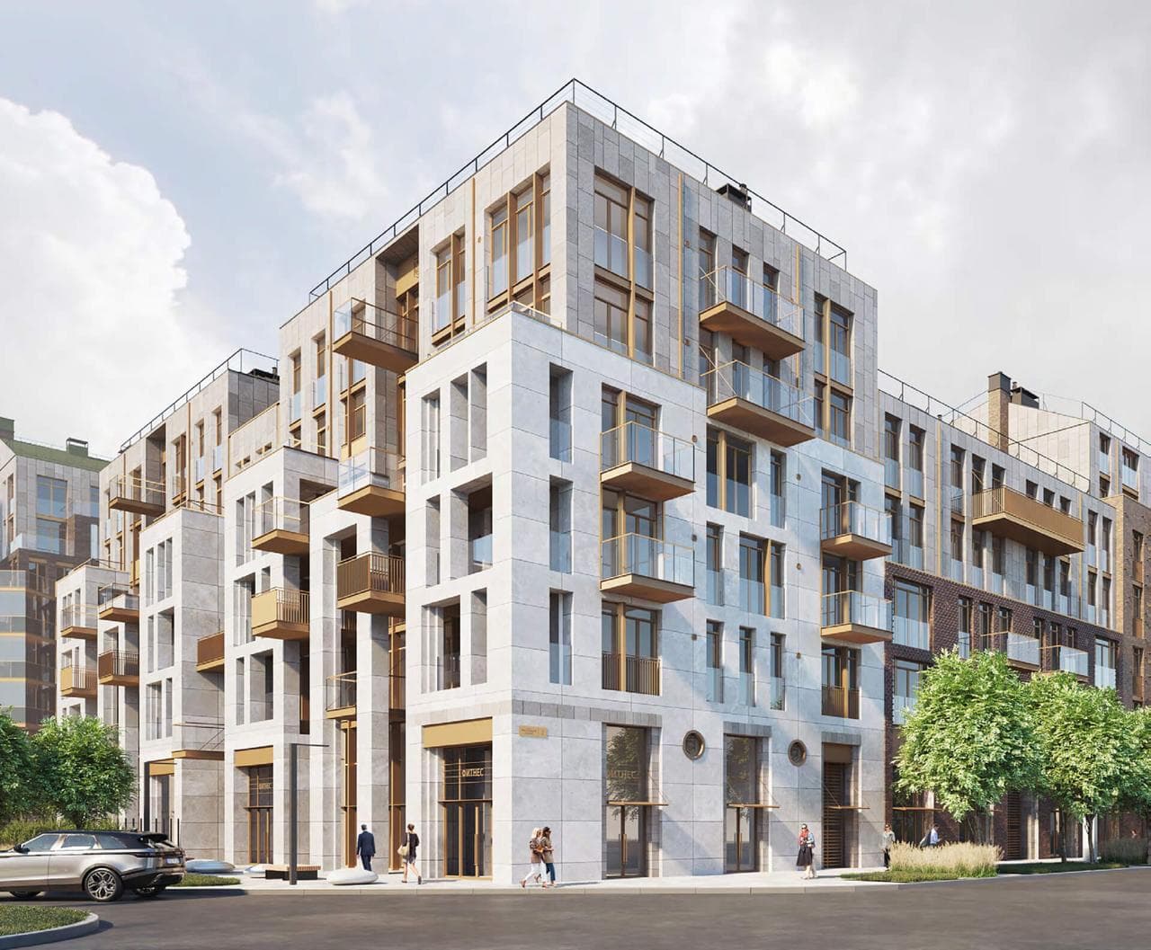 Корпуса разной этажности размещены ступенчато, чтобы максимально использовать панорамные виды на Неву и центр города. В проекте предусмотрены «парящие» балконы, французские окна и террасы, создающие дополнительное ощущение открытости и простора. Архитектура подчёркивает статус и респектабельность комплекса.